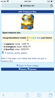 Congratulations inside Treasure Box you found 4 Cake(s) value: 8000 FP 2 Cow Milk(s) value: 4000 FP 2 apple(s) value: 3000 FP